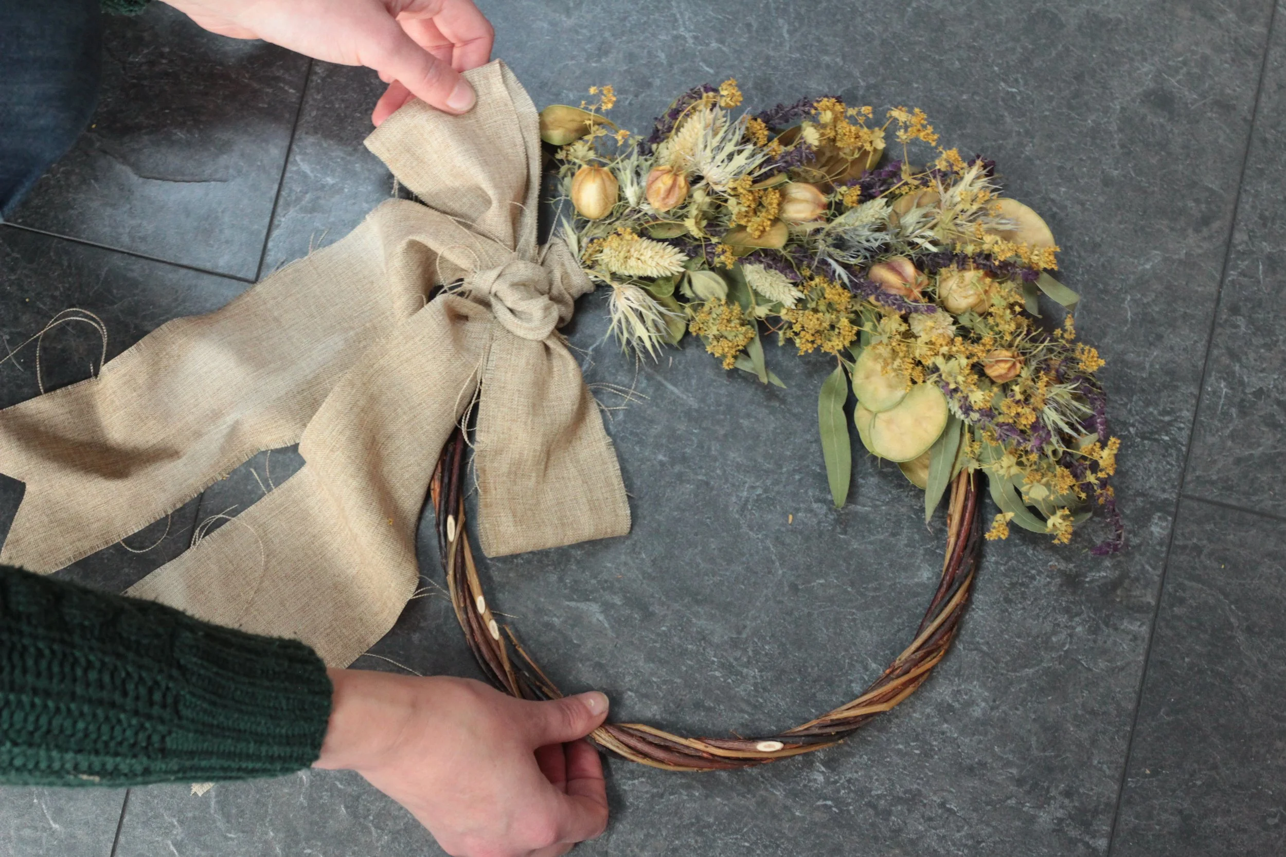 With the dried flower wreath we use different materials to attach the flowers and foliage to the willow base. These pieces will last you many years to come with the correct care.